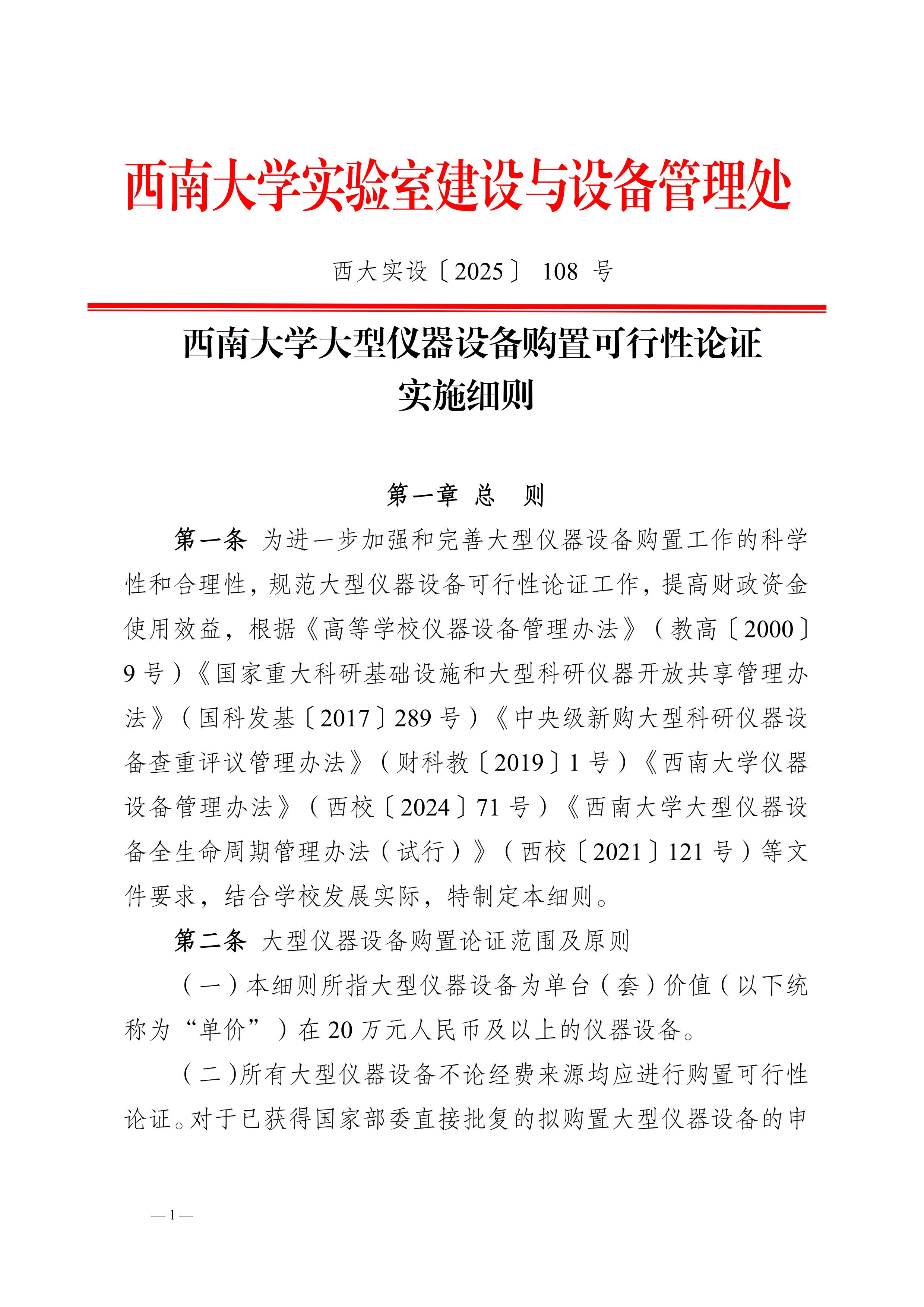 西南大学大型仪器设备购置可行性论证实施细则-西大实设〔2025〕 108 号