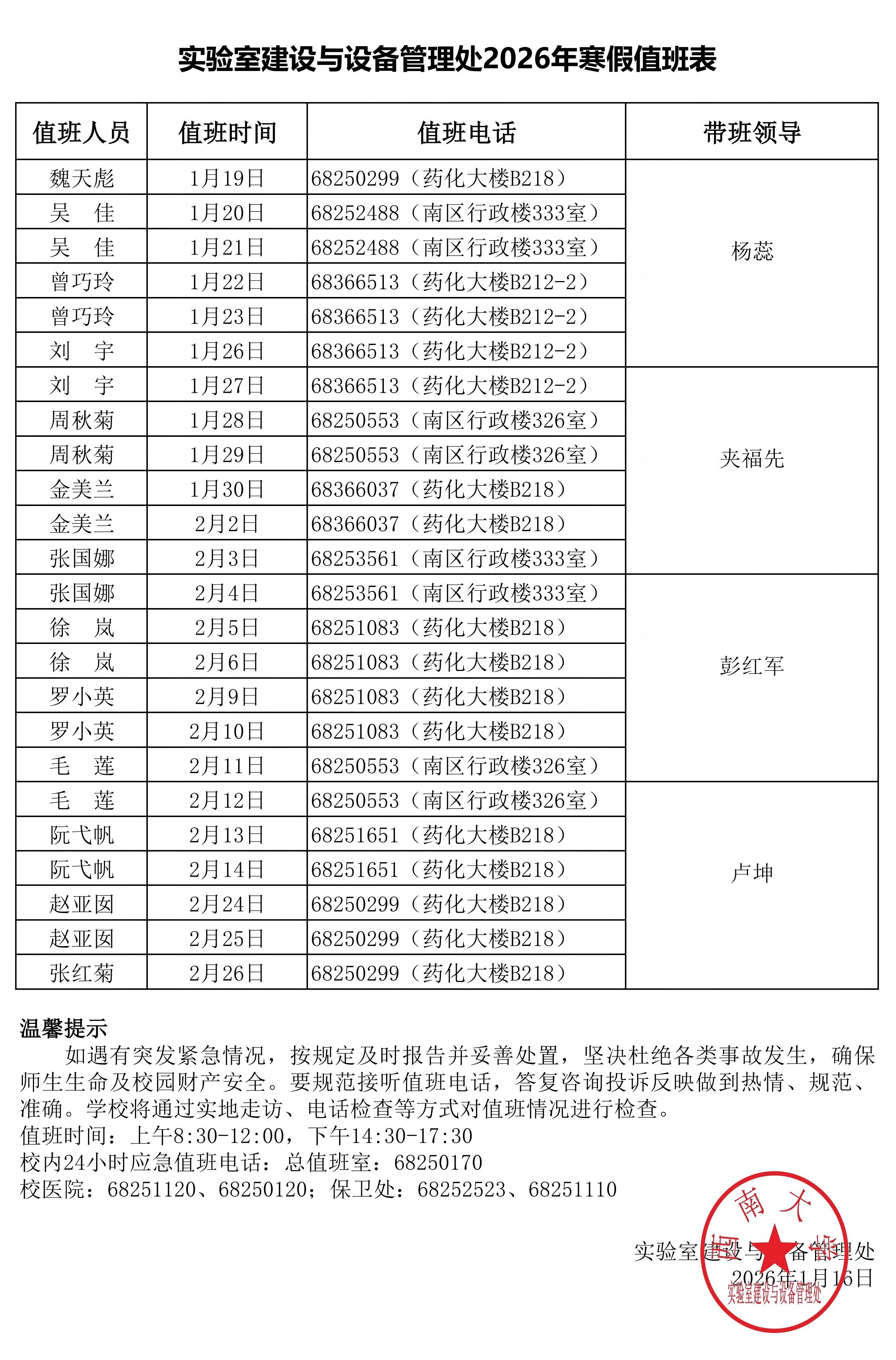 实验室建设与设备管理处2026年寒假值班表-西大实设〔2026〕5号