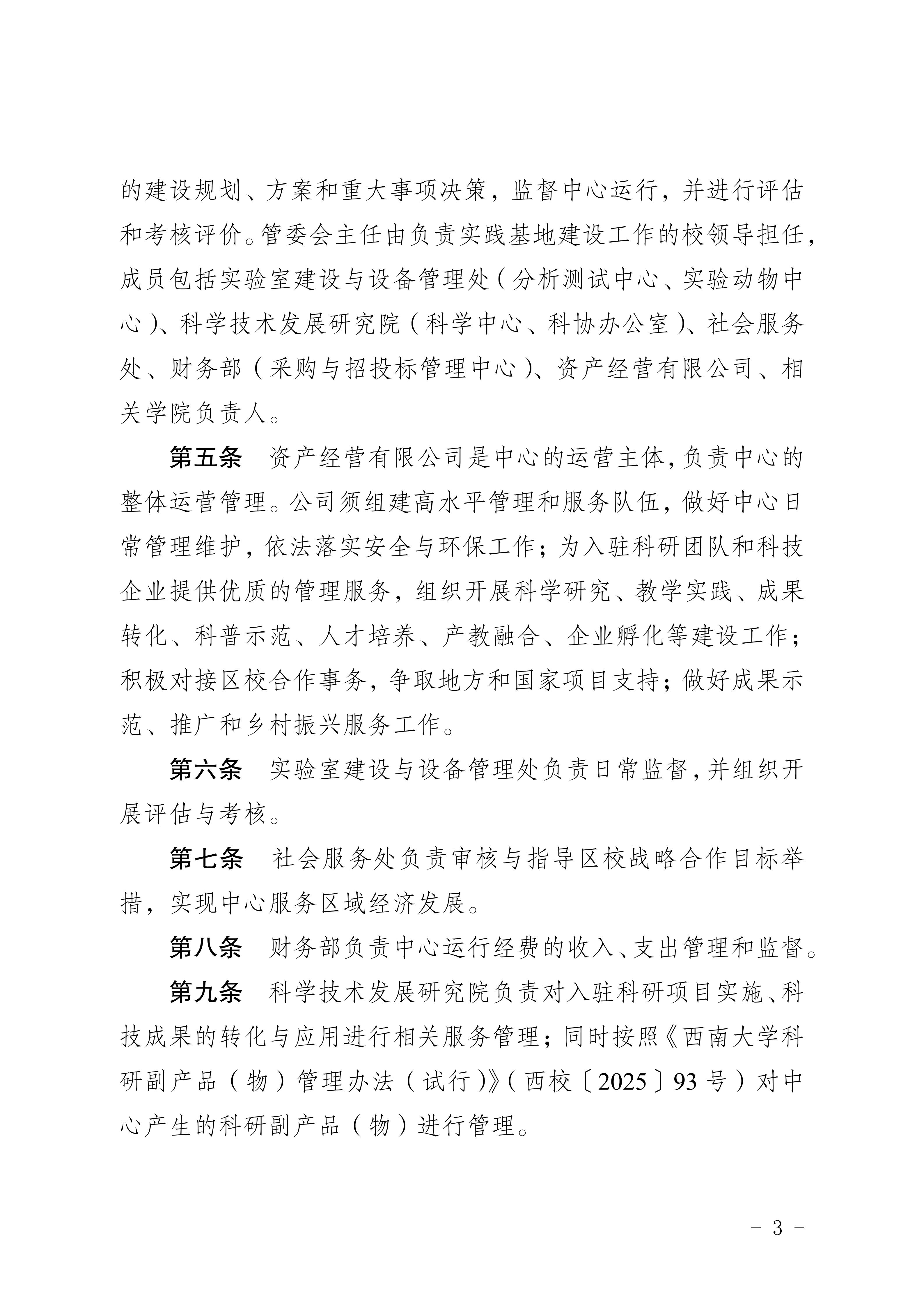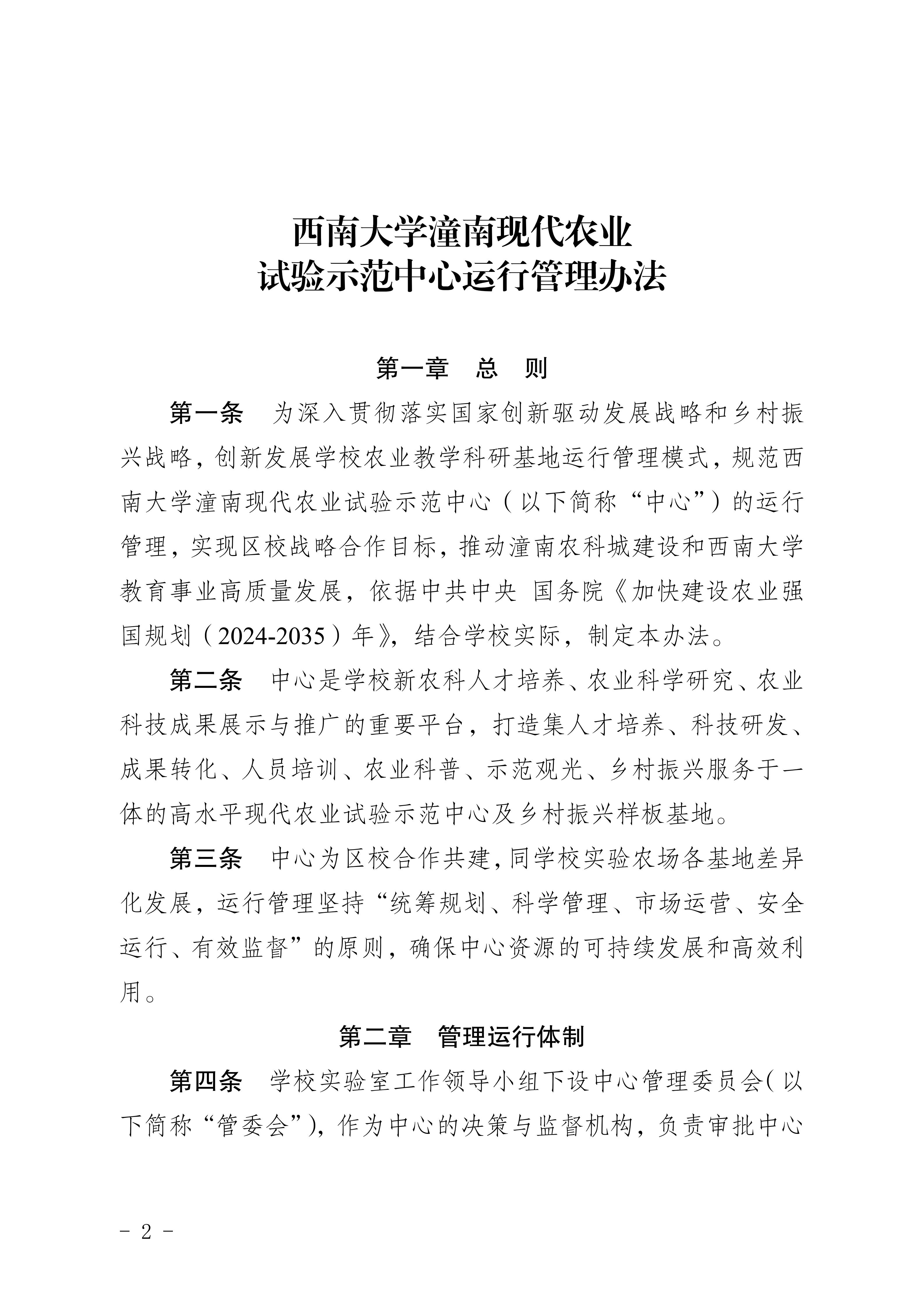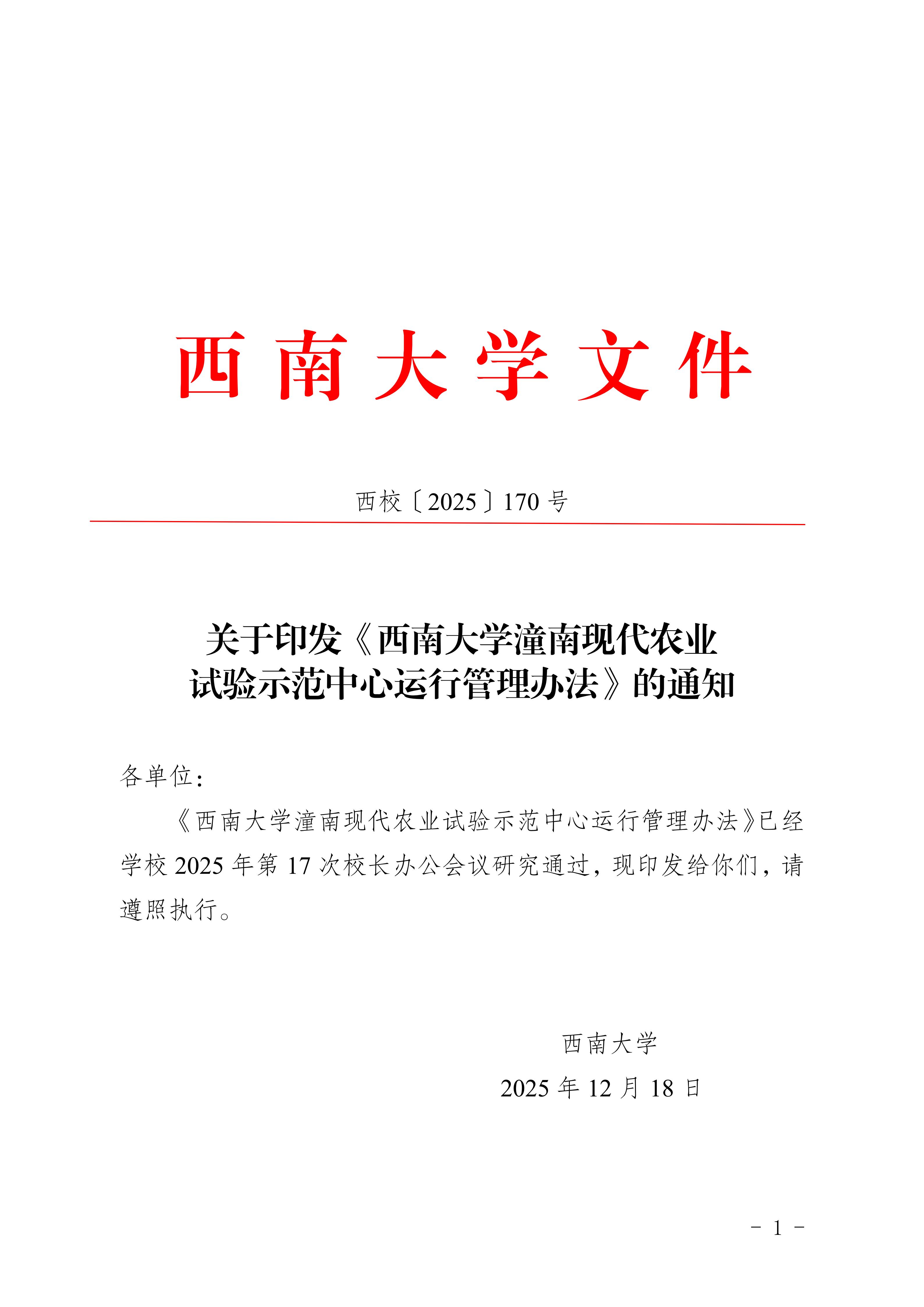 关于印发《西南大学潼南现代农业 试验示范中心运行管理办法》的通知-西校〔2025〕170 号