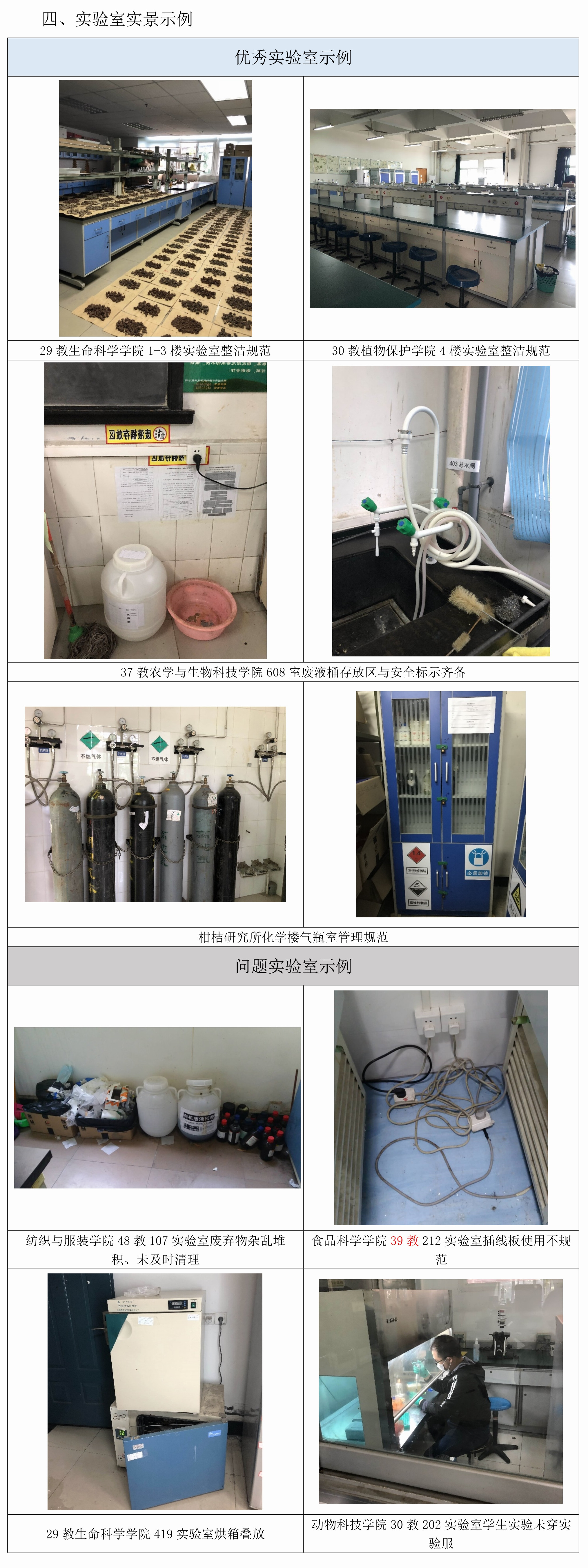 学校实验室安全巡检小组于4月19-28日间对19个自然科学类二级单位实验室进行了实地检查,重点复查问题实验室整改成效和实验室用水、用电与个人防护等基础安全工作开展情况。本次检查结果显示:师生安全意识有所提升,二级单位实验室安全管理力度加强,实验室清洁卫生与危险化学品管理状况大有改善,以材料与能源学部为代表的部分单位圆满完成3月问题实验室整改任务,部分单位安全员和实验室安全责任人工作到位,所管辖实验室整洁、规范。但仍有实验室漠视安全工作和学校通报,实验室安全隐患久查不改。现将实验室安全工作到位和存在问题的单位及实验室通报如下,望各二级单位及实验室向优秀单位及个人学习,不断提高实验室安全管理水平,切实做好实验室安全工作。同时,望被通报的问题实验室认真整改,学校将于5月重点督查两次通报复查仍未整改完成的实验室,届时仍未完成整改将给予查封直至整改验收通过。
