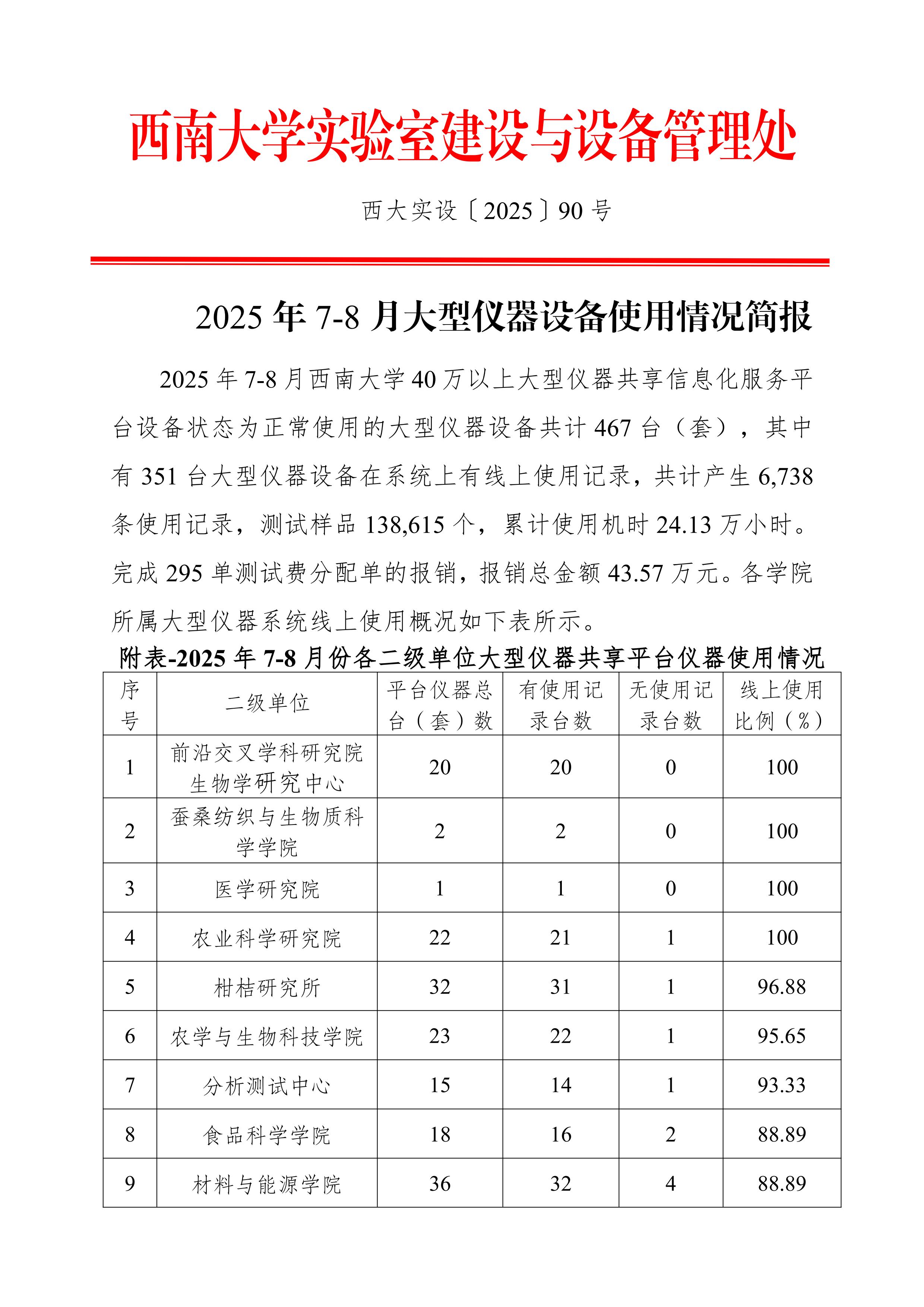 2025年7-8月大型仪器设备使用情况简报-西大实设〔2025〕90号