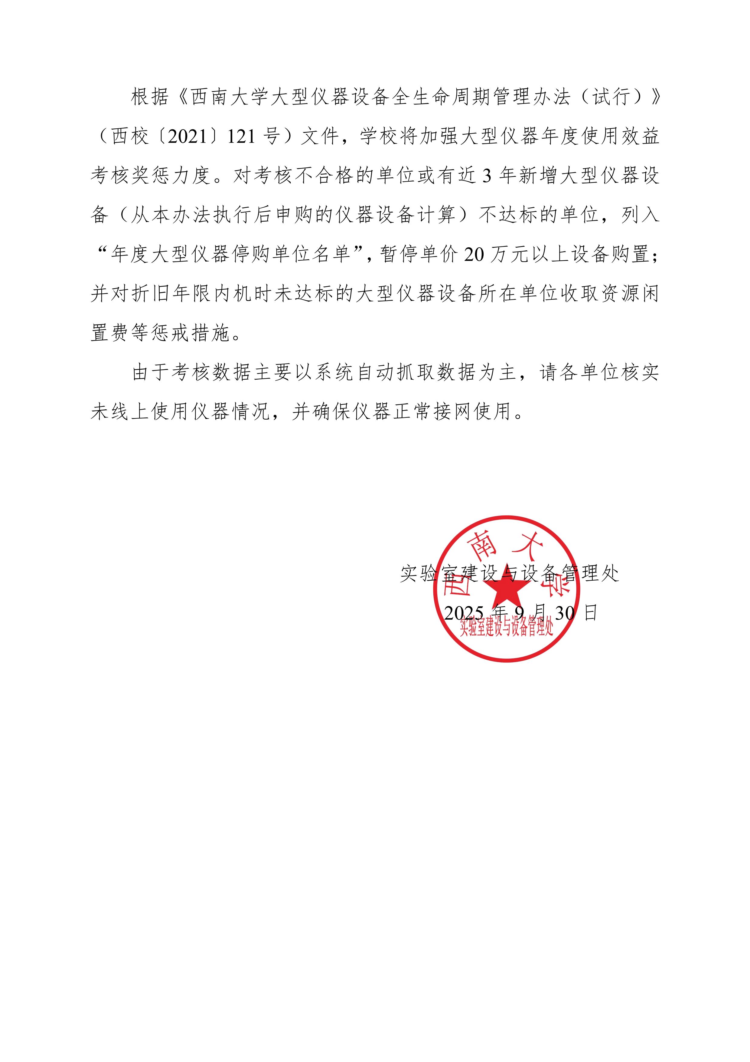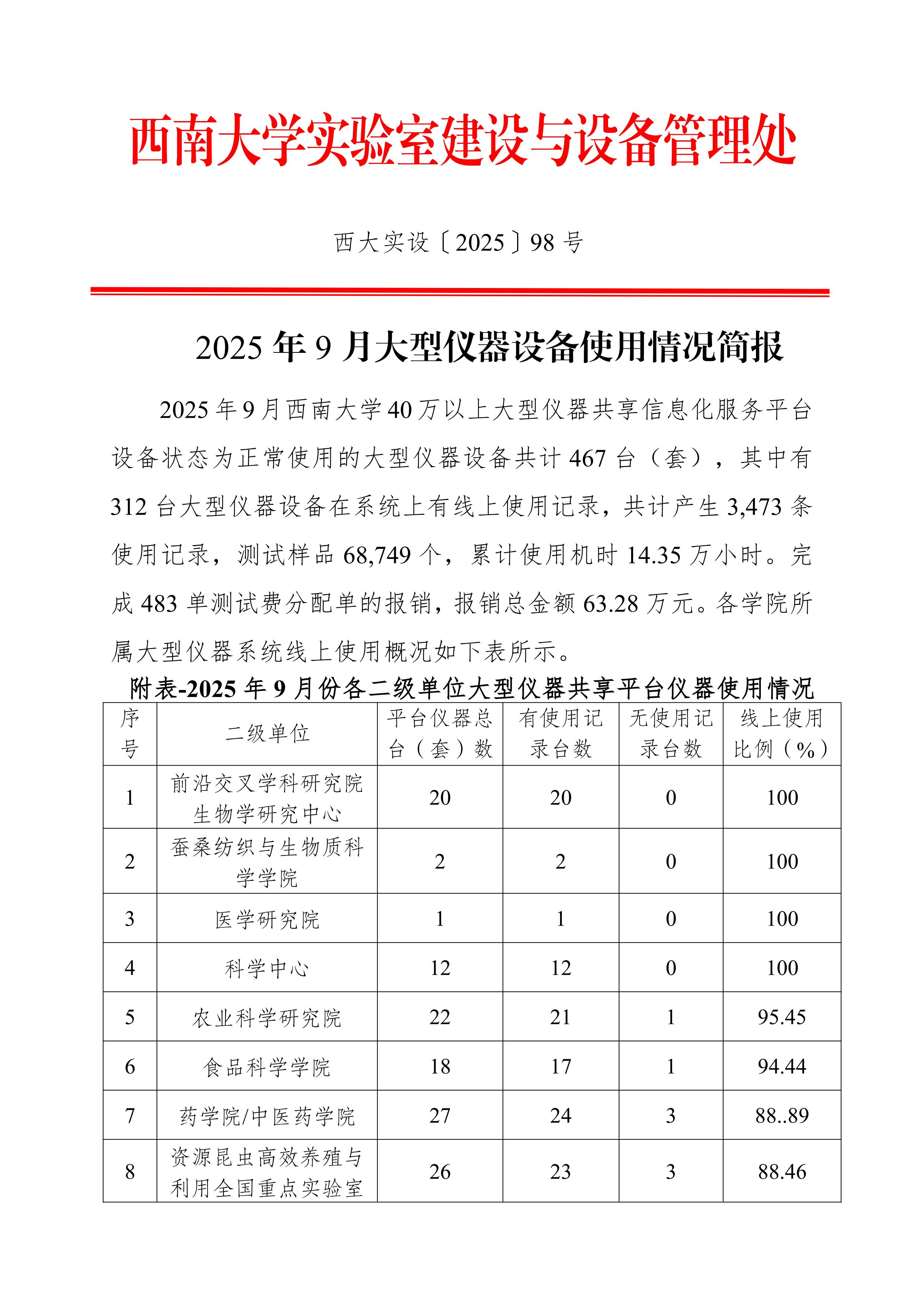 2025年9月大型仪器设备使用情况简报-西大实设〔2025〕98号