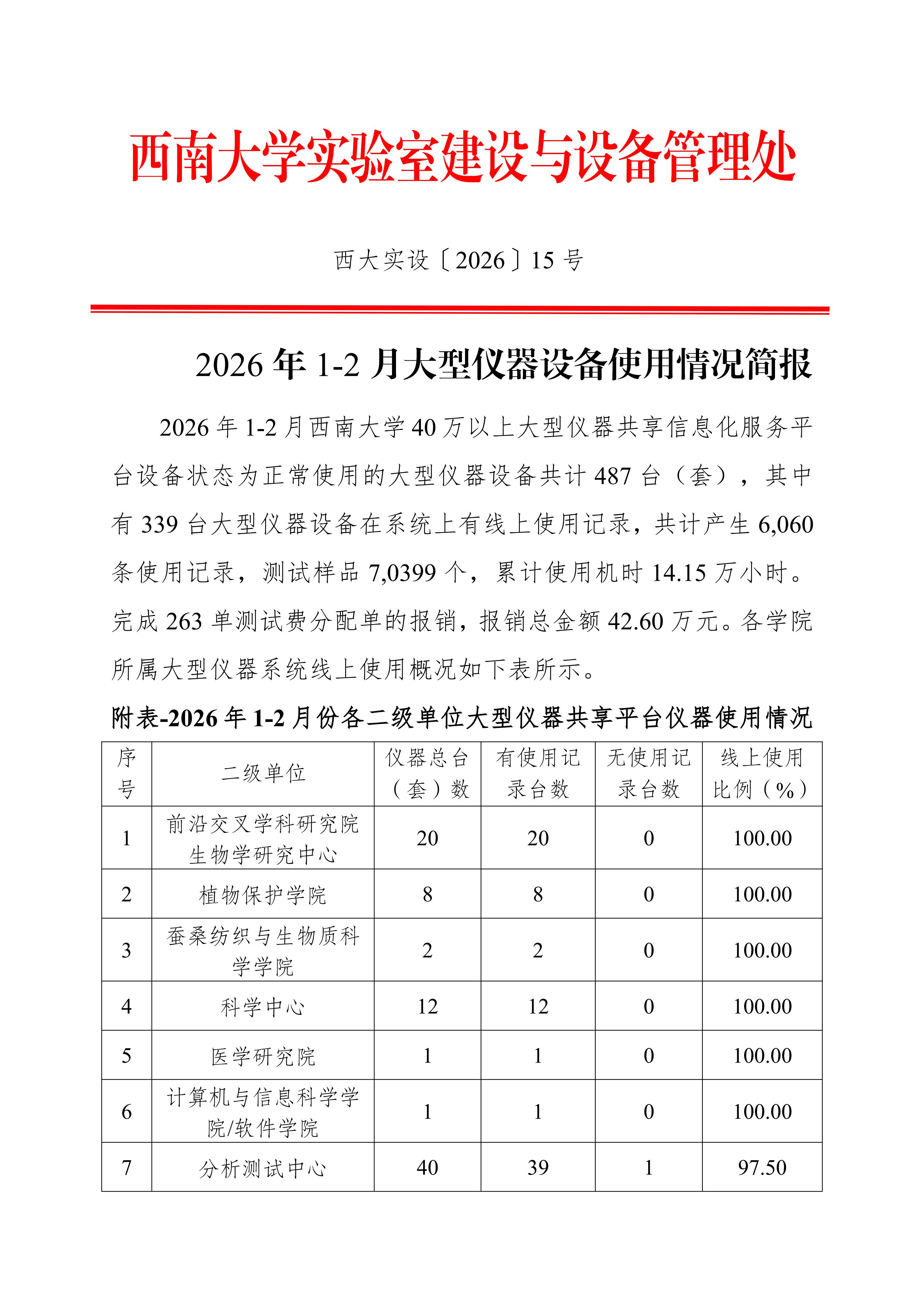 2026年1-2月大型仪器设备使用情况简报-西大实设〔2026〕15号
