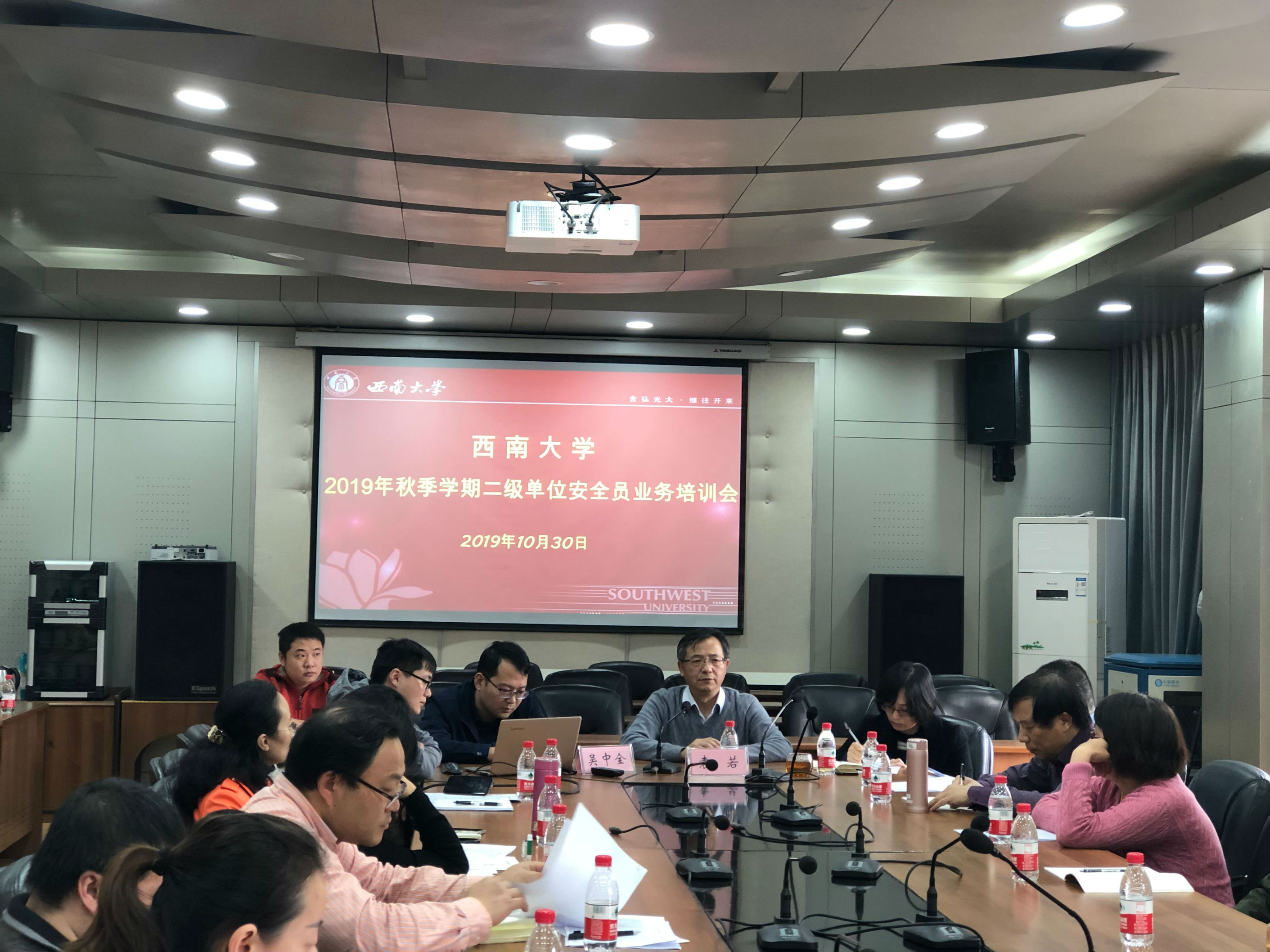 为进一步贯彻落实教育部、重庆市教委和学校实验室安全相关工作要求,提升二级单位实验室安全管理水平,提高安全员业务工作水平,10月30日下午,学校在文俊楼三楼会议室举办2019年秋季学期二级单位安全员业务培训会,学校实验室安全巡检小组专家、25个自然科学类、16个人文社会科学类二级单位和荣昌校区47名安全员参加培训。