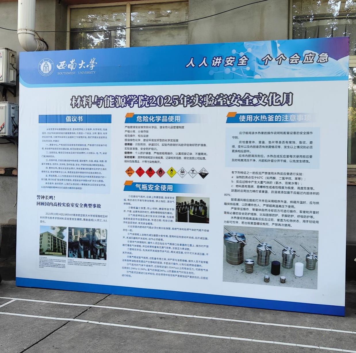为全面加强实验室安全管理,切实提升师生安全意识和应急处理能力,材料与能源学院于2025年10月10日至31日成功开展了“2025年实验室安全文化月”系列活动。本次活动内容丰富、形式多样,涵盖文化展播、安全培训、废弃物处置演练及消防演习等多个方面,在全院范围内营造了“人人讲安全、个个会应急”的浓厚氛围。