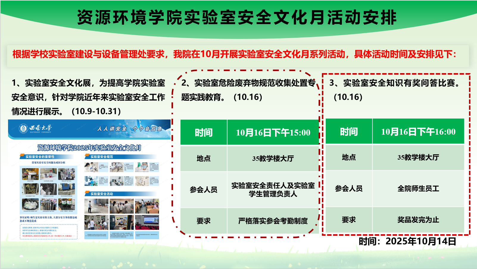 10月9日-31日,资源环境学院围绕“筑牢安全防线,赋能绿色发展”活动主题,紧密结合学科特色,成功举办了2025年实验室安全文化月活动。本次活动通过系统化宣传教育与多元化实操训练,全面强化了师生的安全意识与应急技能,为学院教学科研工作的顺利开展构筑了坚实的安全屏障。