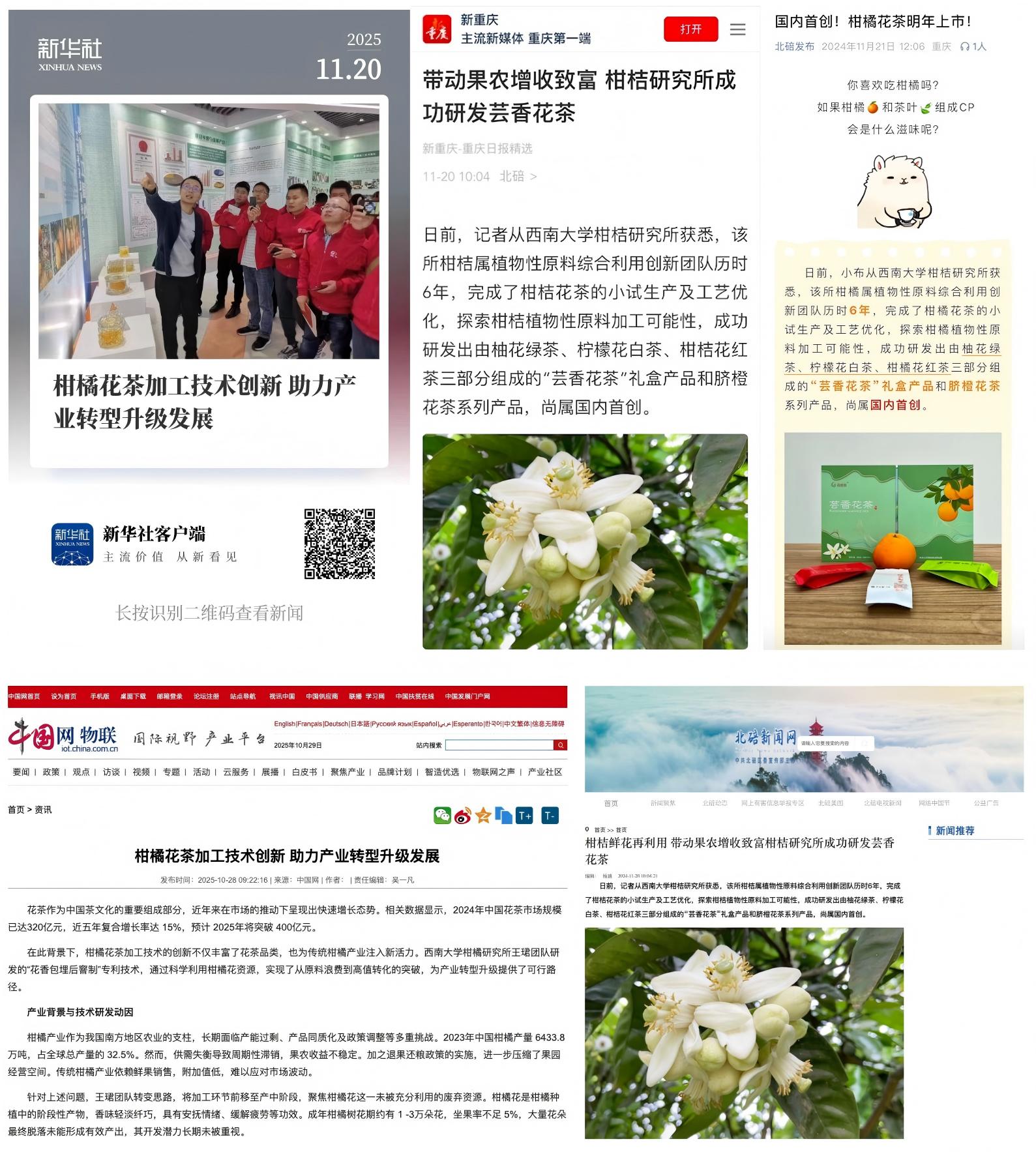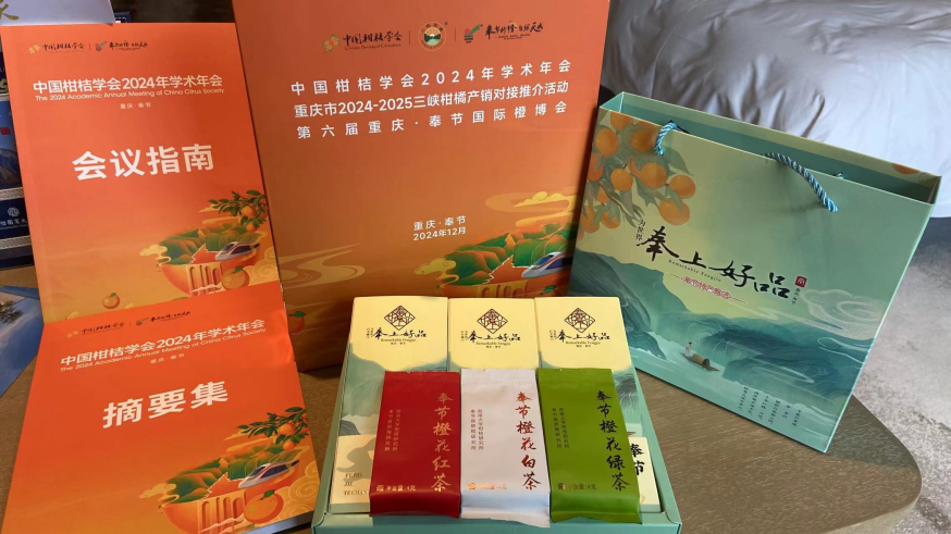 2024年11月,团队突破春花制茶的传统模式,通过优化果园用药管理,实现柑桔秋花资源的加工利用,并为奉节县定制开发奉节脐橙花茶产品,在同年12月召开的中国柑桔学会2024学术年会上作为会议伴手礼亮相,获得广泛认可。