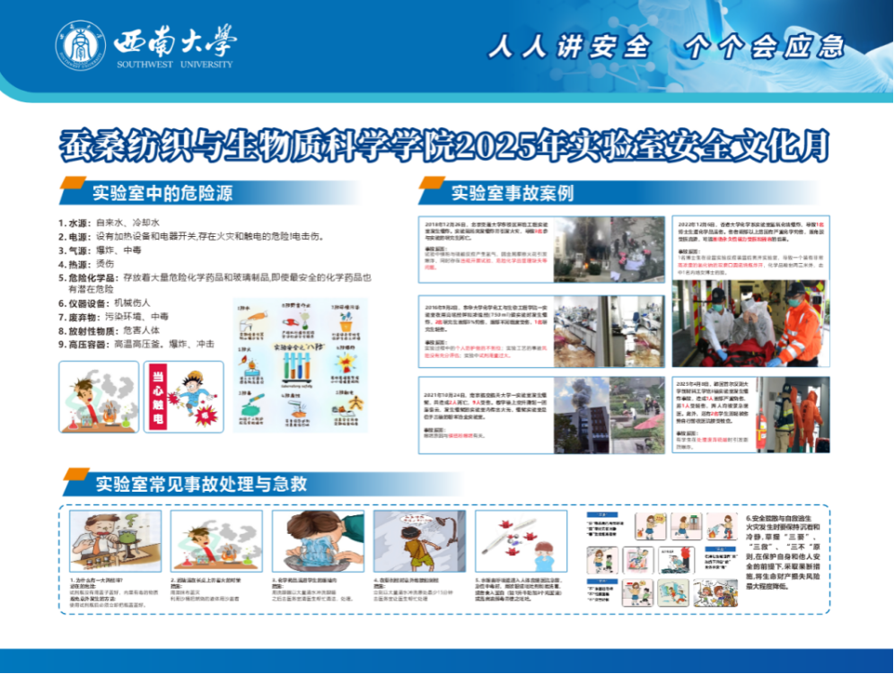 为筑牢校园安全防线,全面提升师生安全素养与应急能力,蚕桑纺织与生物质科学学院于10月10日至31日精心策划并成功举办了“实验室安全文化月”系列活动。本次活动围绕宣传教育、互动参与、实战演练三大板块展开,内容充实、形式多样,吸引了广大本科生、研究生及教师的积极参与,取得了显著成效。